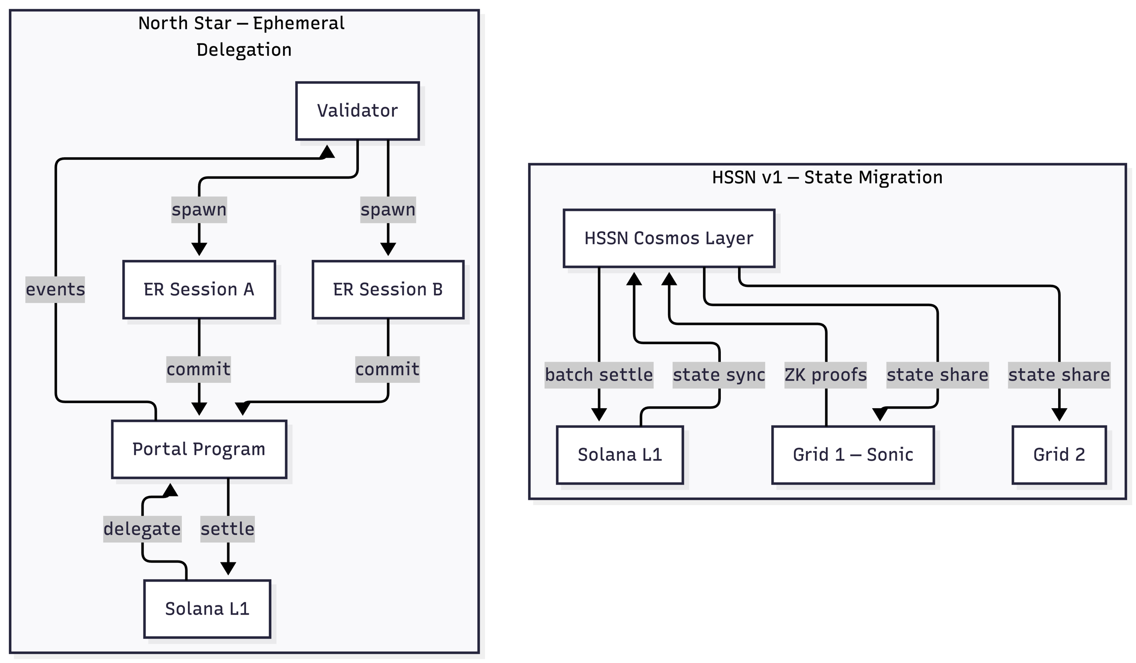HSSN v1 was Sonic's first-generation approach to enabling cross-grid state sharing. It established the foundational idea of extending Solana's execution environment into specialized SVM grids — the same architectural instinct that drives North Star. North Star represents an evolution of this model: rather than sharing persistent state across grids via a coordination layer, it provisions dedicated, session-scoped execution that settles directly back to L1.